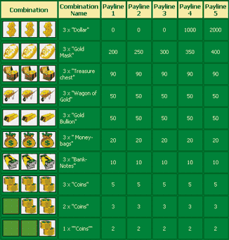 The symbols that compose winning combinations include: Dollars, Gold Masks, Treasure chests, Wagons of Gold,